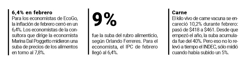 Por otro lado, según la consultora Orlando Ferreres, la inflación de febrero fue de 6,4% mensual y registró un crecimiento interanual de 101,5%. Según C&T, los precios minoristas para la región GBA subieron 6,2% en febrero, alcanzando el 105% anual.