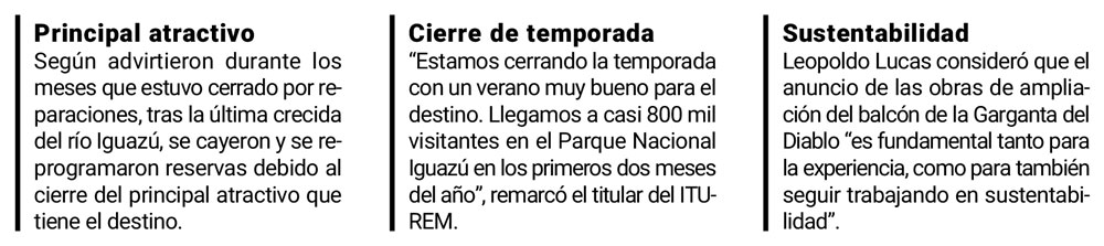 En consecuencia, consideró que el anuncio de las obras de ampliación del balcón de la Garganta del Diablo, que realizó el gobernador Oscar Herrera Ahuad durante la presentación de las pasarelas, tratando de duplicar la cantidad de personas que puedan visitar en un momento, “es fundamental tanto para la experiencia como para también seguir trabajando en sustentabilidad”.