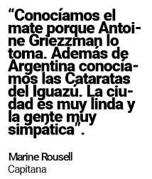 Marine Rousell coincidió. “Probamos el mate y me gustó, es distinto al té y lo prefiero amargo”, dijo la jugadora que hoy saldrá a la cancha con la cinta de capitana en el debut del equipo francés ante Estados Unidos, desde las 20, en Wanda, en un partido correspondiente a la Zona B.
