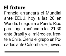 En cuanto al Mundial, Francia es parte del “grupo de la muerte”. Tiene a Brasil y a Colombia como rivales, dos de los más fuertes del torneo; además de Estados Unidos y Chile. El debut será esta noche ante las norteamericanas, mañana será el turno de enfrentar a Brasil en el último duelo de la jornada en Puerto Rico; el miércoles se enfrentarán a Chile, a partir de las 20 en la misma ciudad, y el jueves se medirán con Colombia en Posadas, a partir de las 21.30.