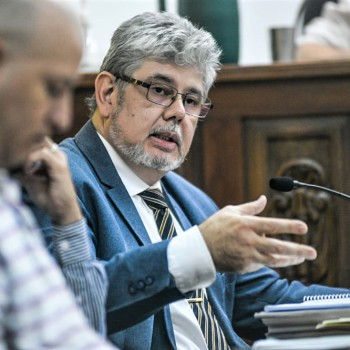 ALEGATOS. Los jueces escuchan este jueves al fiscal Vladimir Glinka (derecha) y al defensor de Monzón, Miguel Varela (izquierda).