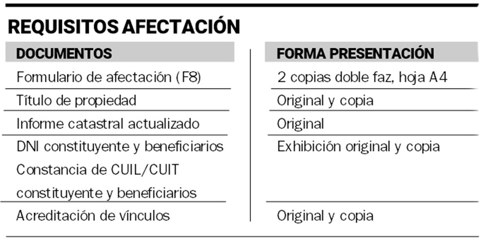 Para que la vivienda esté protegida, debemos inscribirla en el Registro de la Propiedad Inmueble. Para ello, debemos solicitar la afectación en dicho Registro, mediante la presentación del Formulario de Afectación, acompañando la documentación que se solicita al efecto, conforme figura en el cuadro adjunto