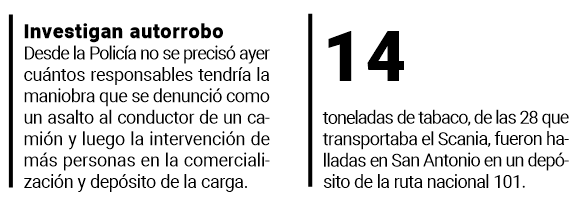 Investigadores de la Unidad Regional VII intentan esclarecer el robo de un camión cargado de tabaco ocurrido hace pocos días pero que ayer habría dado un vuelco y lo que se denunció como un asalto armado y en banda al conductor del transporte se transformaría en una falsa denuncia para ocultar un autorrobo.