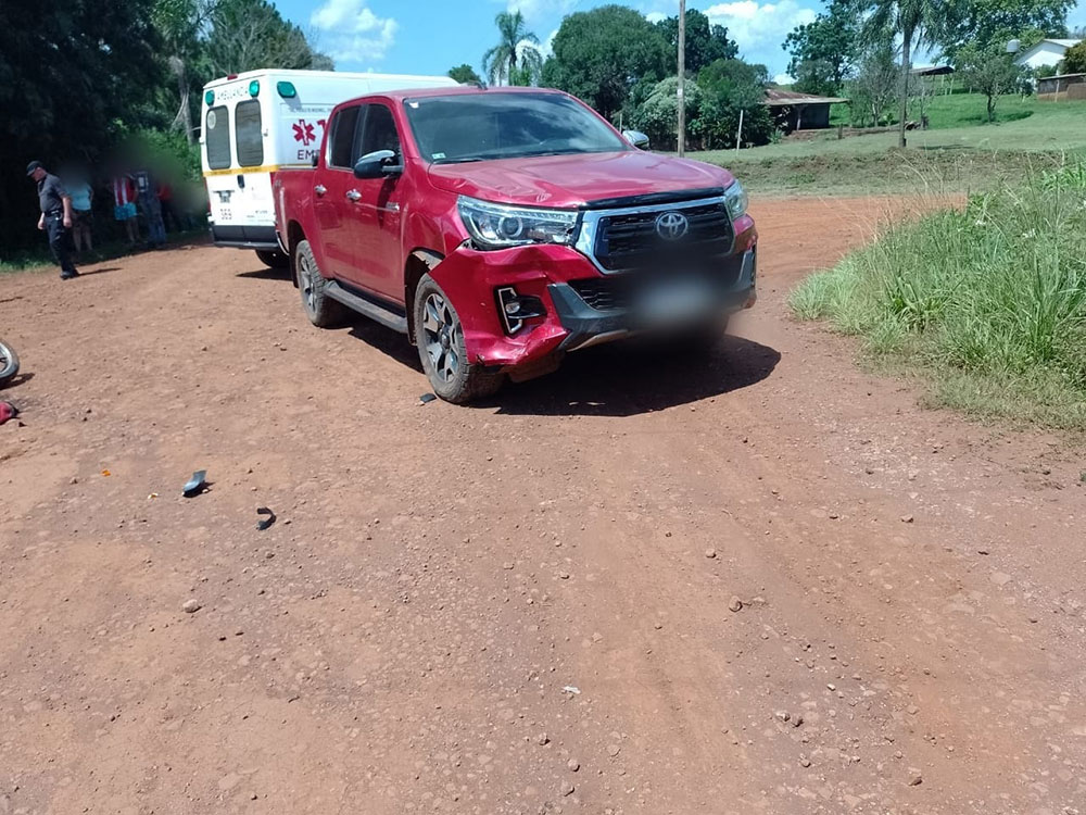 Por causas que se tratan de establecer en cercanías a la Escuela N°509, Colonia Seguin, una Toyota Hilux conducida por un hombre de 55 años impactó contra una motocicleta Imsa Road.