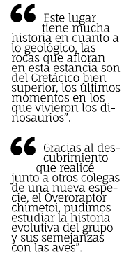 “Este lugar tiene mucha historia en cuanto a lo geológico, las rocas que afloran en esta estancia son del Cretácico bien superior, es decir, los últimos momentos en los cuales vivieron los dinosaurios hace 65 millones de años. Entonces estas rocas, que fueron formadas en esa edad, contienen restos de esqueletos de distintos tipos de dinosaurios, que fueron el puntapié inicial para que Fernando y todo el equipo, en el cual me incluyo, fuimos a varias campañas, creo que esta ya fue la sexta y que siempre fueron fructíferas”, contó Matías que es becario doctoral del CONICET y trabaja en el Museo Argentino de Ciencias Naturales “Bernardino Rivadavia”.