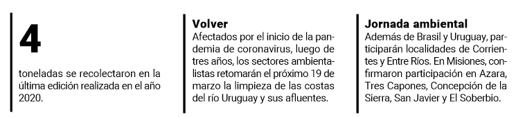 Para la jornada del próximo domingo invitó “a todo aquel poblado que tiene contacto con algún arroyo que desemboque en este río, que se sume para este día”. Rojas detalló que, hasta el inicio de esta semana, tenían programado “limpiar parte del arroyo Chimiray, en El Soberbio; y San Javier también hará limpieza en arroyos y en el río”.