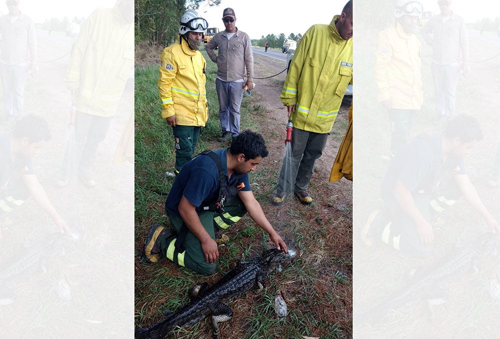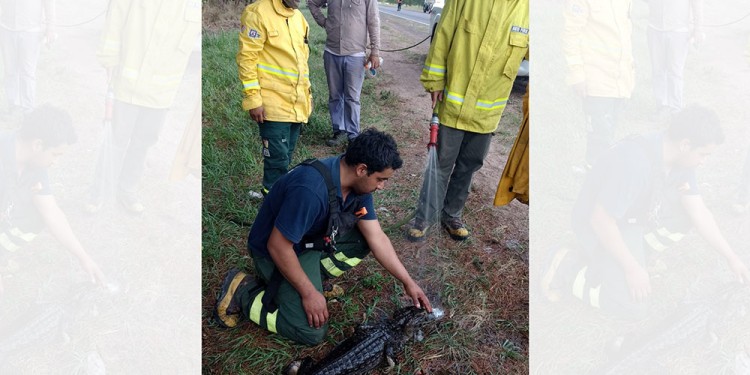 Un equipo de bomberos y brigadistas rescataron a un ejemplar de Yacare que estaba en la zona forestal de Villa Olivari, #Corrientes. El ejemplar estaba siendo perjudicado por las llamadas del lugar . El ejemplar recibió atención por parte de los bomberos. pic.twitter.com/sRMuM9okO2