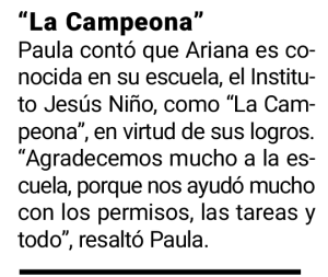 Una apuesta ganadora. Después de una temporada tremenda y de los reconocimientos que recibió en la Fiesta del Deporte 2022 de PRIMERA EDICIÓN, Ariana Ocampo (16) finalmente recibió ayer la beca de 500 mil pesos otorgada por el Diario en base al rendimiento que demostró tanto a nivel nacional como internacional.