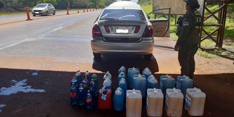 Efectivos dependientes del Escuadrón 13 “IGUAZÚ” de Gendarmería Nacional procedieron a realizar el control físico-documentológico de un vehículo con patente paraguaya, cuando a simple vista detectaron que en el interior transportaba varios bidones y botellas cargados con combustible.