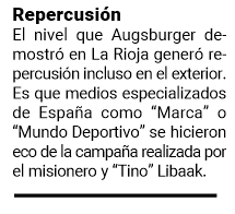 “Qué decir de vos ‘Tino’. Lograste con 17 años lo que cualquier chico de tu edad quiere y, como te lo dije, me gustó vivirlo a tu lado”, publicó ayer Augsburger, tras agradecer además al entrenador Ignacio “Nacho” Aranda.