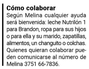 “Tengo dos hijos. Uno es totalmente especial, no vidente, parapléjico, tiene epilepsia, parálisis cerebral y se alimenta sólo por sonda porque tiene reflujo grado 4. Él está en internación domiciliaria en casa. Nosotros vivimos en una casita de 3×4 en la cual tenemos un techo de chapa de cartón y una carpa extendida arriba”, comenzó explicando Melina, ilustrando la situación en la que viven como familia.