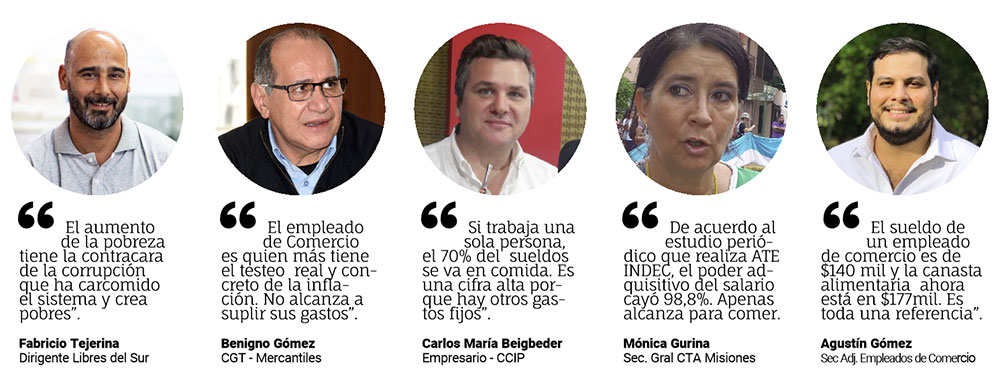 El secretario general del gremio de los mercantiles y de la CGT Misiones, Benigno Gómez, remarcó, en tanto, que “las estimaciones de ingresos superan totalmente los índices de la pobreza”, dijo y enfatizó que “una familia tipo de Misiones que trabaja en el comercio destina más del 80% de su salario en comida y nosotros lo sabemos porque somos quienes, a requerimiento de los jefes, vamos remarcando los precios”.