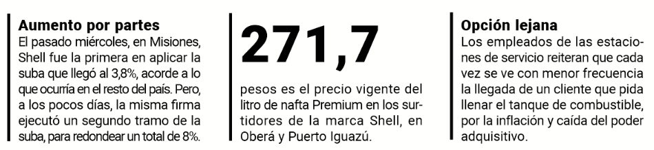 Cabe recordar que el pasado miércoles, en Misiones, la empresa Shell fue la primera en aplicar la suba, que llegó al 3,8%, acorde a lo que ocurría en el resto del país. Sin embargo, a los pocos días, la misma firma volvió a elevar el valor de las naftas súper y premium que, así, llegaron a un total de 8% de incremento, duplicando lo acordado con la Nación.