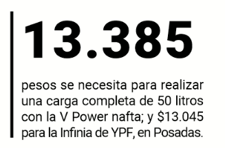 En Oberá, llenar un tanque de 50 litros con la V Power nafta de Shell representa un gasto de $13.585; mientras que con la Infinia de YPF hay que pagar $13.240. Para la carga completa con nafta Súper se requiere de $11.385 y $10.540, respectivamente.