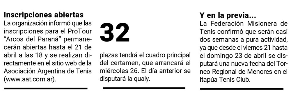 Tras el regreso del Circuito Profesional de la AAT, el año pasado, la Federación Misionera confirmó que la capital tendrá dos nuevos torneos este año: el primero arrancará el martes 25 de abril. “El objetivo es que los más chicos tengan su primera experiencia profesional”, dijo Edu Messa a EL DEPORTIVO.