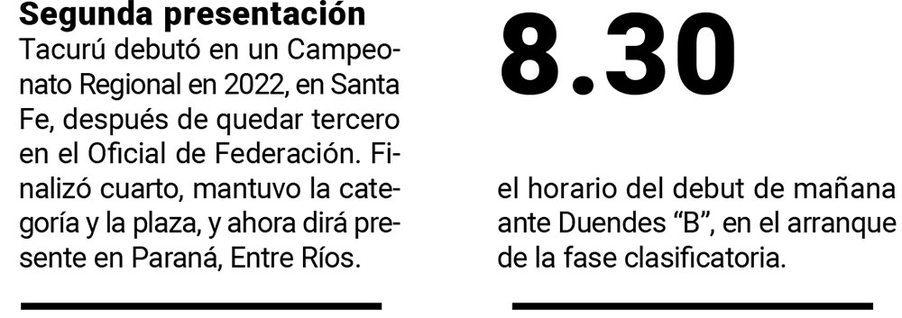 Esta será la segunda participación para Tacurú en un Regional, después de competir en 2022 en Santa Fe, instancia a la que clasificó tras quedar tercero en el Oficial de la Federación y donde finalizó en la cuarta posición y logró mantener la categoría.