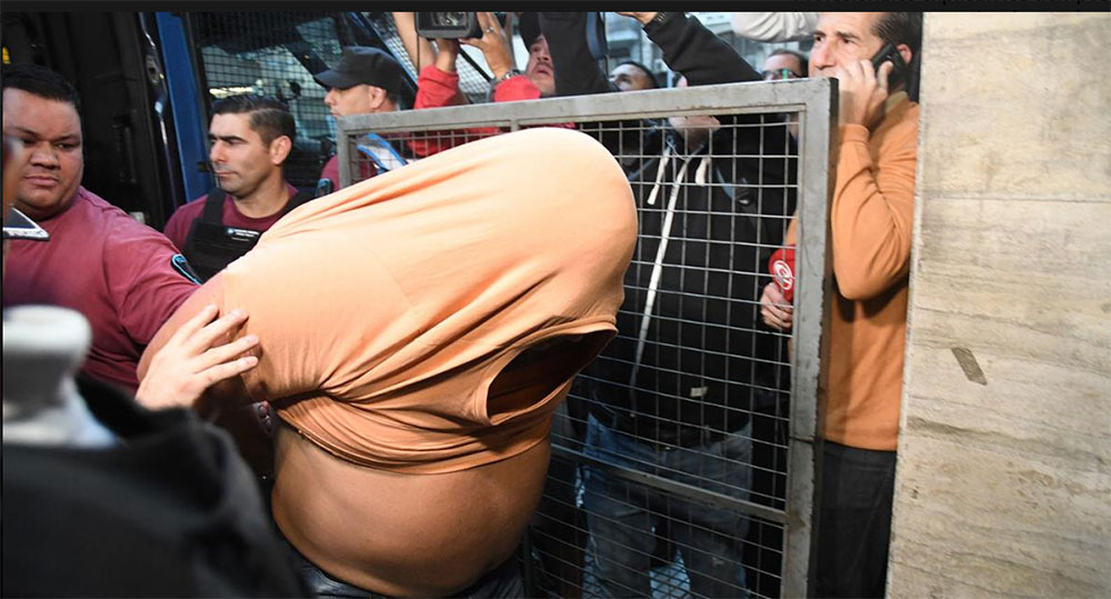 Exactamente a las 7.12, el primero en descender de uno de los vehículos de la Unidad de Traslado de la Policía de la Ciudad fue Mermet, con su rostro tapado con un buzo naranja.