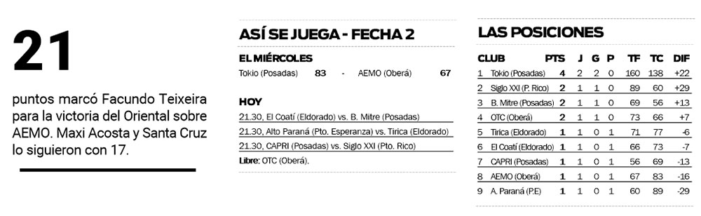 Vale recordar que la fecha se inició con el triunfo de Tokio ante los Municipales obereños, que hicieron su debut en el certamen. Mariano González, de AEMO, fue la gran figura de la noche y máximo artillero con 35 puntos, pero los mismos no fueron suficientes.