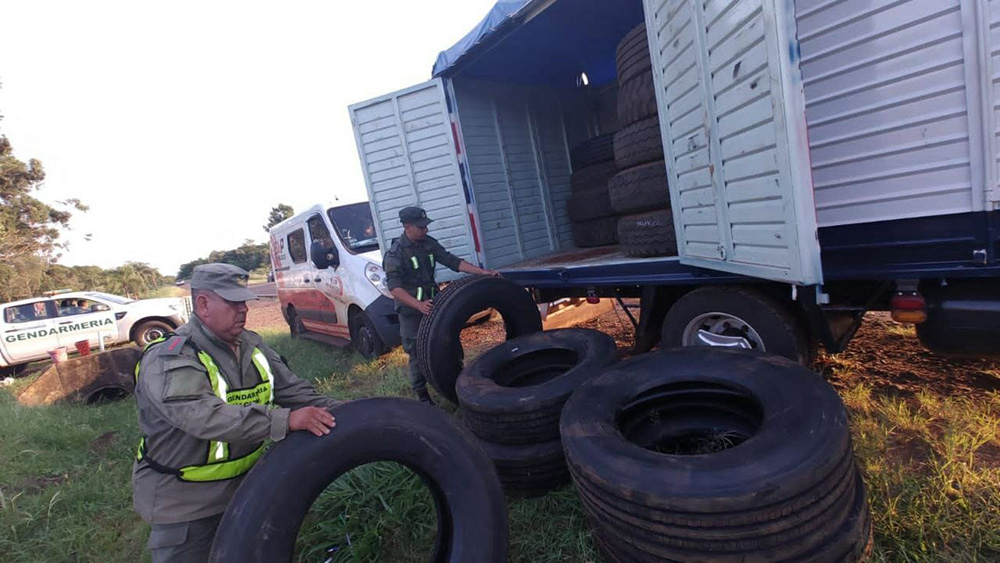 Efectivos de Gendarmería Nacional incautaron en las últimas horas una gran cantidad de cubiertas de origen extranjeros. El procedimiento se efectuó sobre la ruta provincial 211, altura Paraje “Las Campiñas” de Dos de Mayo.