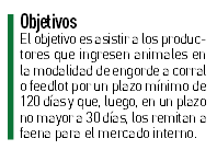 Según lo dispuesto en la normativa, el programa es para “asistir a los productores que ingresen y mantengan el ganado bovino en la modalidad de engorde a corral por un período mínimo de 120 días y a su término, en un plazo no mayor de 30 días, lo remitan a faena para el mercado interno, mediante la asignación de un beneficio económico hasta un límite máximo de 100 cabezas, con la finalidad de asegurar la oferta de carne vacuna para consumo nacional y contribuir a la mitigación del impacto del incremento de los costos de alimentación de su sector productivo”.