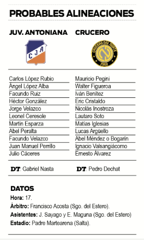 Por su parte, el conjunto de Gabriel Nasta viene de perder en el clásico salteño frente al Albo y tendrá un cambio obligado. Es que Enzo Vargas fue expulsado y ese puesto sería ocupado por el experimentado Juan Manuel Perrillo. Además, el cuerpo técnico espera hasta el último momento por la recuperación de Leonel Ceresole.