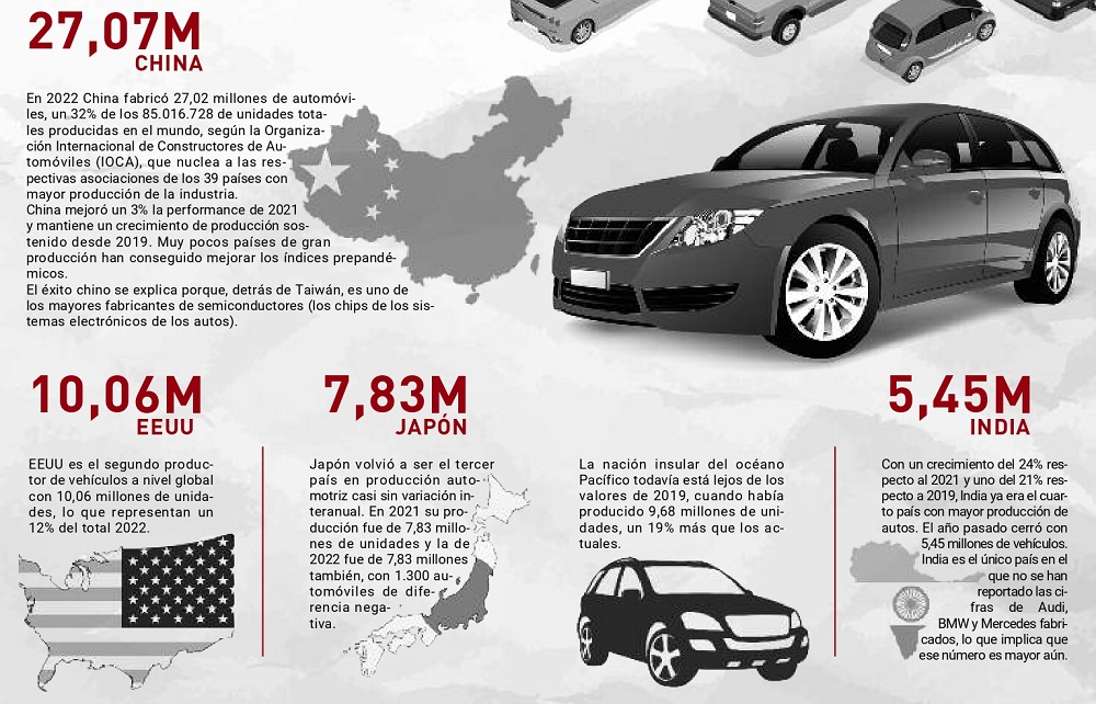 La producción actual de vehículos en China duplica a los fabricados en EEUU y Japón. Los asiáticos son dominadores del mercado de la movilidad eléctrica, donde tienen el 80% de la provisión de baterías de toda la industria.
