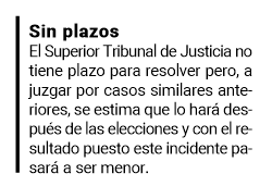 El Superior Tribunal de Justicia no tiene plazo para resolver pero, a juzgar por casos similares anteriores, se estima que lo hará después de las elecciones y con el resultado puesto este incidente pasará a ser menor.