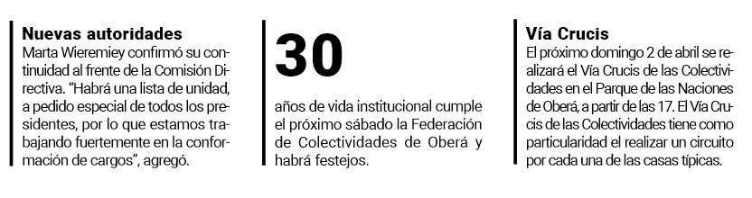 La Federación de Colectividades de Oberá llevará a cabo este miércoles su Asamblea General Ordinaria con elección de autoridades. Además el 1 de abril celebra 30 años de vida institucional.