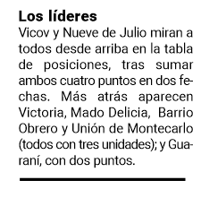 El torneo tiene dos líderes consumada la jornada y son Deportivo Vicov y Deportivo Nueve de Julio. El Rutero, en el estadio de Hogar y Selva, dio cuenta de Unión de Montecarlo por 2-0 con un doblete del defensor Gastón Gauto.