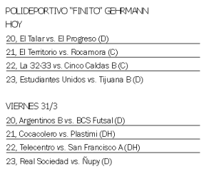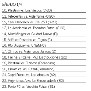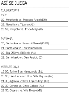 Claro que la acción también se vivirá en el histórico polideportivo de la avenida Cabred, el Club Brown, donde los juegos comenzarán a las 22 con un partidazo que promete: Metrópolis, que suma 4 puntos, se medirá con Posadas Futsal, recientemente ascendido a la División de Honor -la máxima categoría local- y que con 7 unidades marcha segundo detrás del puntero Distribuidora Blanc (9).