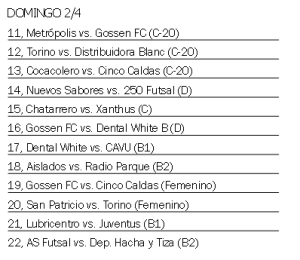 Una hora más tarde, desde las 21 y por la categoría C, El Territorio intentará alcanzar la cima de las posiciones cuando enfrente a Rocamora; mientras que a las 22 y por esa misma divisional, Cinco Caldas B también irá por ese objetivo frente a La 32-33. La noche en ese lugar se cerrará con otro partido de la D, el que tendrá como protagonistas a Estudiantes Unidos y Tijuana B, dos que pelean en la zona media del grupo B.