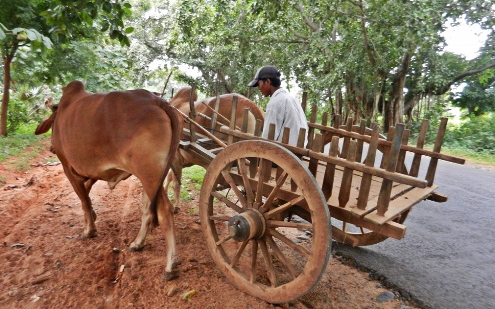 En forma imprevista, una de las vacas que tiraba del vehículo tracción a sangre trastabilló y cayó. Preocupado, el colono descendió y se acercó para ver lo que ocurría. Lo hizo por adelante del carro, colocándose frente al animal caído.