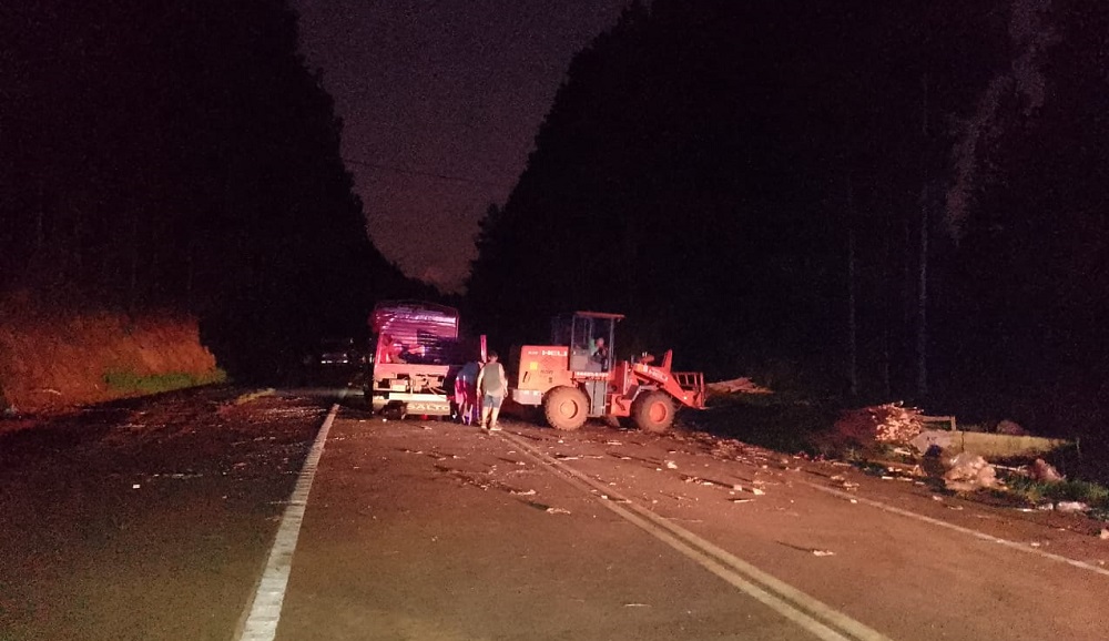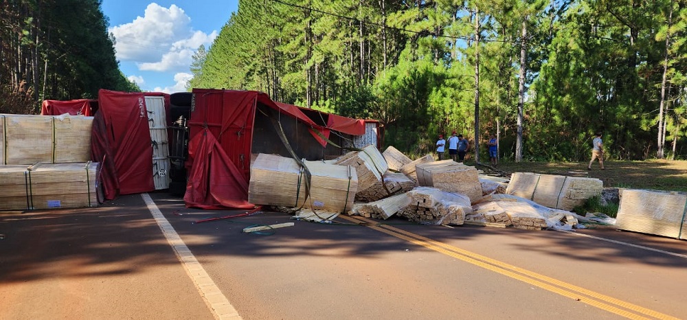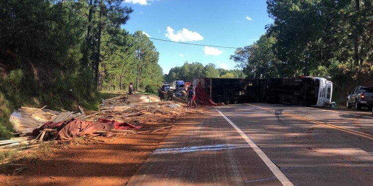 La policía y operarios trabajaron con maquinaria para retirar el rodado y la voluminosa carga de machimbre que quedó esparcida sobre la cinta asfáltica a la altura del kilómetro 902 de la arteria nacional, en inmediaciones del complejo Kachofre de Campo Viera.