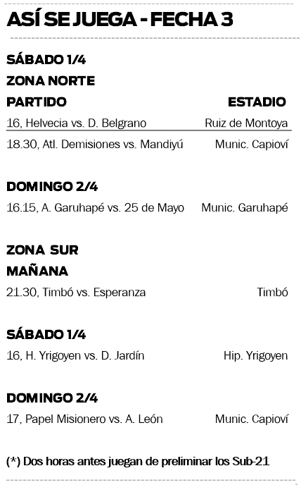 En tanto, que el grueso de la fecha se cumplirá el sábado con los encuentros: Atlético Demisiones vs. Deportivo Mandiyú de Garuhapé y Asociación Helvecia vs. Deportivo Belgrano de El Alcázar, por la zona Norte, y Deportivo Hipólito Yrigoyen vs. Deportivo Jardín América por la zona Sur.
