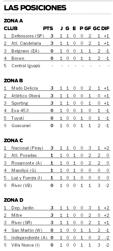 La segunda fecha se jugará este fin de semana con dos adelantos el sábado: Rosamonte vs. Luz y Fuerza, desde las 16.30 en Apóstoles, y Nacional vs. Atlético Posadas, en Piray, desde las 19.30, en ambos casos por la zona B. El resto de los encuentros se llevarán a cabo el domingo, en distintos horarios (ver programación).