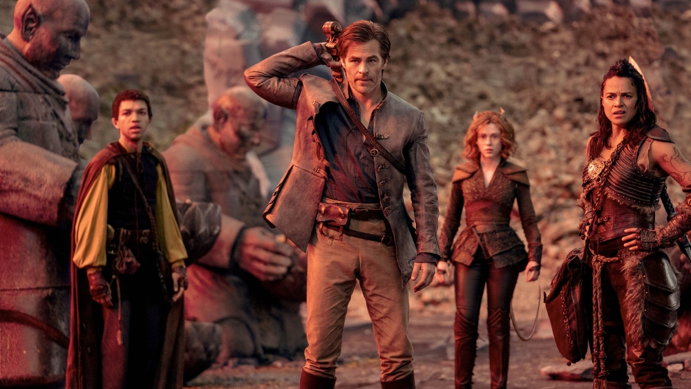Justice Smith plays Simon, Chris Pine plays Edgin, Sophia Lillis plays Doric and Michelle Rodriguez plays Holga in Dungeons & Dragons: Honor Among Thieves from Paramount Pictures.