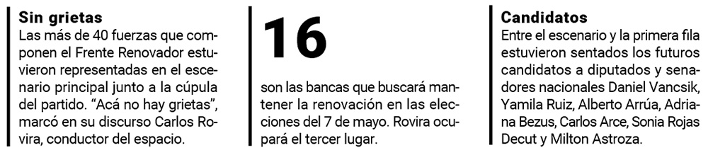 El Frente Renovador pondrá en juego no sólo la continuidad del modelo en el Poder Ejecutivo sino, también, 16 lugares en la Cámara de Representantes de los 20 que se elegirán en mayo. Rovira buscará su reelección ocupando el tercer lugar de la lista.