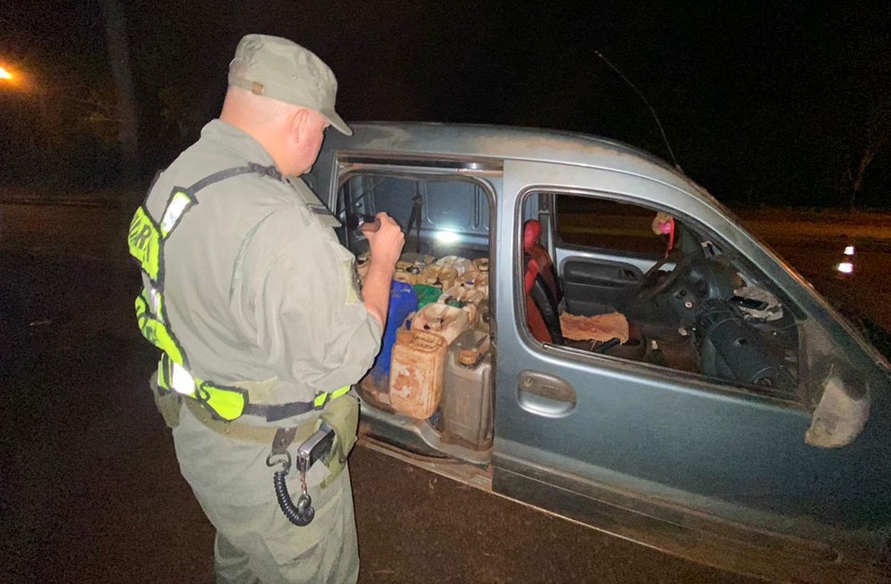Asimismo, efectivos del Grupo de Seguridad Vial “Urugua-í” perteneciente al Escuadrón 13 “Iguazú” detuvieron la marcha de un rodado con patente paraguaya y hallaron bidones y botellas de gaseosas que contenían 60 litros de gasoil. Se dio intervención a la Policía de la provincia s a los fines de efectuar las actuaciones pertinentes, quedando retenidos el vehículo como así también la sustancia.