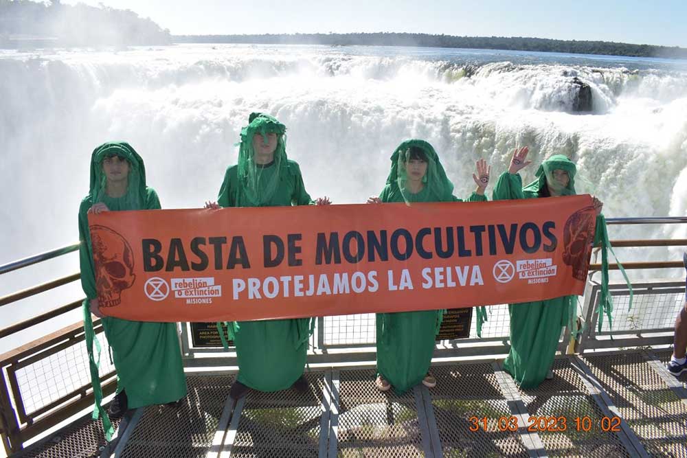 El movimiento “Rebelión o Extinción Misiones” (XR) realizó este viernes 31 a las 12 del mediodía una acción directa en la pasarela de la Garganta del Diablo, dentro del Parque Nacional Iguazú con el fin de hacer un reclamo contra los monocultivos forestales en Misiones.