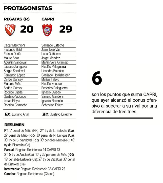 En el complemento, CAPRI ejerció supremacía en las formaciones, tanto fijas como móviles, y eso lo llevó a conseguir dos nuevos ensayos y un par de penales, esta vez mediante las ejecuciones del ingresado Enzo Bistoletti.