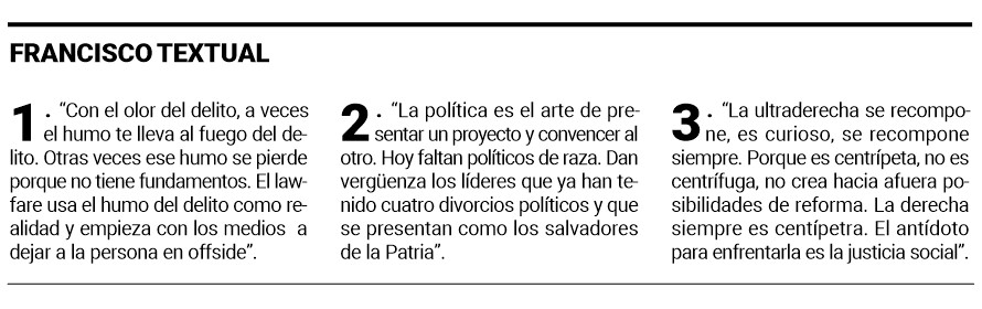 En este sentido, el Santo Padre marcó: “Con el olor del delito, a veces el humo te lleva al fuego del delito. Otras veces es un humo que se pierde porque no tiene fundamentos. El lawfare usa el humo del delito como realidad y empieza con los medios de comunicación a dejar a la persona en offside”.