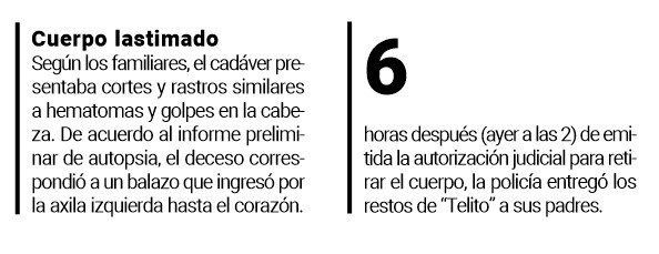 También señalaron que en la Morgue, los policías de guardia no les permitieron identificar el cuerpo. El cajón fue llevado por una empresa funeraria hasta el barrio Santa Cecilia, a la casa de la madre de “Telito”, y allí pudieron verlo a las 2.30 de ayer, seis horas después que el juez Mattos habilitara el retiro de la Morgue Judicial.