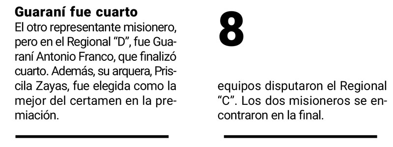 Las estadísticas le dan la razón: además de que los dos equipos misioneros llegaron a la final, la mejor jugadora del certamen fue Sol Duarte de Centro de Cazadores y el premio a la mejor arquera del torneo quedó en manos de Silvina Barrios, la guardameta de CAPRI, encargada de desatar el festejo tras contener el último remate de Centro, lo que consagró a las de Villa Cabello.