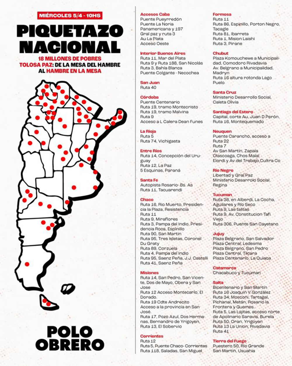 El llamado “piquetazo nacional” también apunta, al igual que la protesta de este martes, contra la Ministra de Desarrollo Social. “Tolosa Paz: de la mesa del hambre al hambre en la mesa”, reza una de las consignas piqueteras.