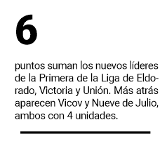 Tanto Victoria como Unión mandan con seis unidades, pero podrían ser superados por Deportivo Vicov (4), que mañana visitará a Nacional de Puerto Piray desde las 20 para cerrar la fecha. Hoy jugarán Mado-Delicia y Barrio Obrero, desde las 20.45.