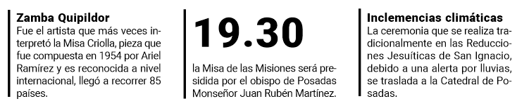 La Misa Popular de las Misiones es una ceremonia muy especial que se realiza en el corazón de las Reducciones Jesuíticas, este año cambia de locación debido a las inclemencias climáticas. Grandes voces de la música argentina han acompañado y formaron parte de la celebración. Este año, Gregorio Quipildor más conocido como Zamba Quipildor, considerado una de las voces más importantes del folclore latinoamericano será el encargado de interpretar la Misa Criolla, en lo que es su gira de despedida.
