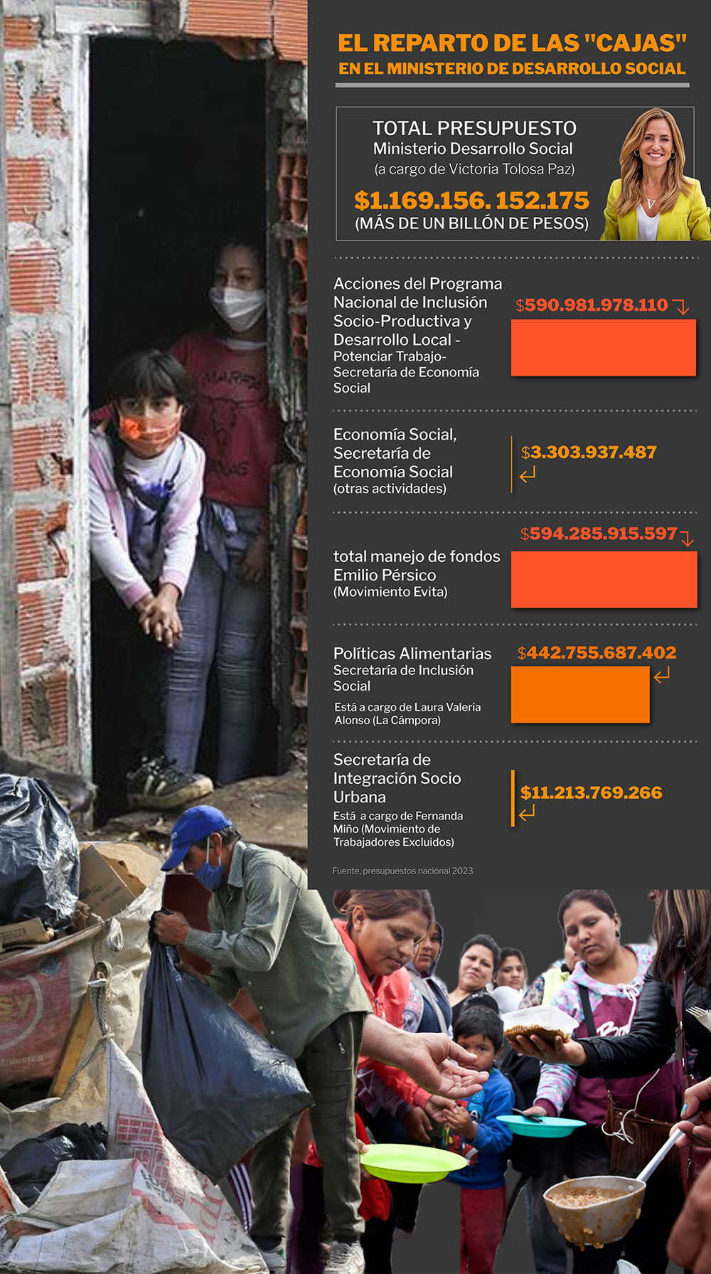 El Potenciar Trabajo es el principal programa de asistencia social que se maneja desde el Ministerio de Desarrollo Social a cargo de Victoria Tolosa Paz, que cuenta con una partida anual prevista en $585.000 millones, lo que equivale a la mitad del presupuesto total que administra la cartera, de unos $1,17 billones.