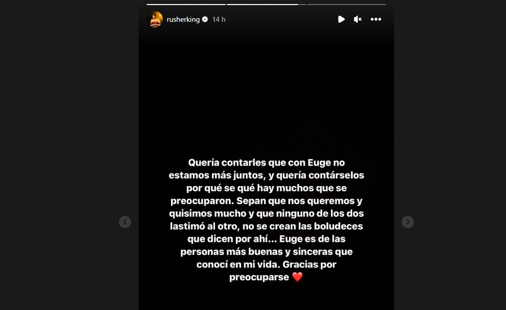 Rusherking utilizó las historias de su cuenta de Instagram para informar, en términos bien claros la separación. Allí, escribió: