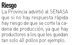 Sin embargo, desde Misiones ya advirtieron al organismo nacional que si no hay respuesta rápida hay riesgo de que se corte la cadena de producción, ya que hay productores a los que les quedan tan solo 40 pollos, por ejemplo, y podrían quedarse sin nada estos.