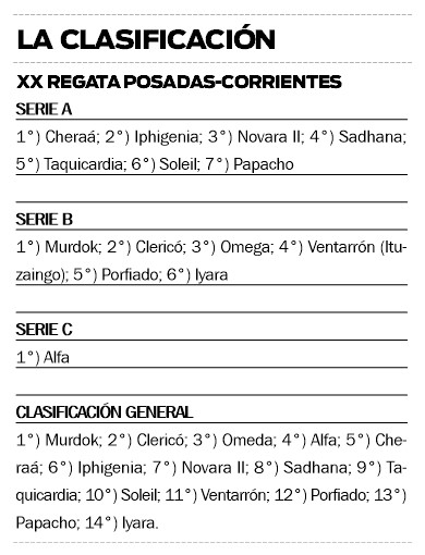 Mientras que tras los cómputos, en la clasificación general el ganador de la XX edición fue el velero Murdok, tripulado por Leopoldo “Ronco” Mendiondo, Hugo Montiel (ambos de Corrientes) y Juan Camarassa (de Resistencia).